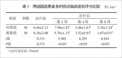 ③疼痛程度,劇烈疼痛 3 分,一般疼痛 2 分,微痛1分,無痛0分;記錄患者在治療前、治療第2周、第 4 周及第 8 周的癥狀評分,分數越高表示癥狀越嚴重。