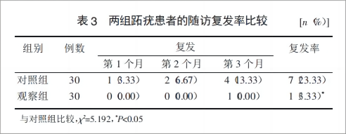 隨訪3個月,對照組共有7例復發(23.33%),觀察組1例復發(3.33%),2組復發率比較差異具有統計學意義(P<0.05)(表3)。